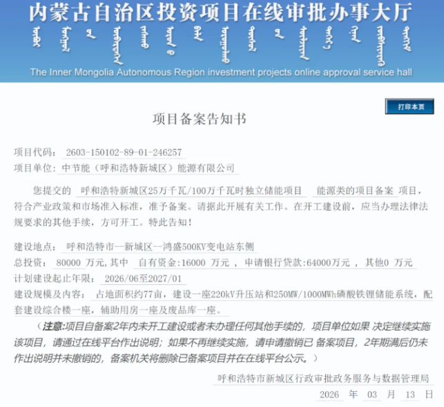 近日,中节能呼和浩特新城区250MW/1000MWh电网侧独立储能示范项目成功获得备案。